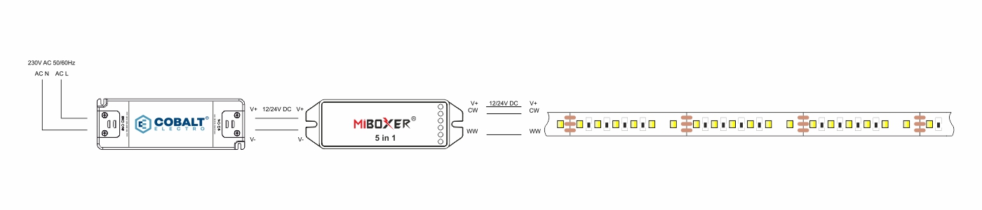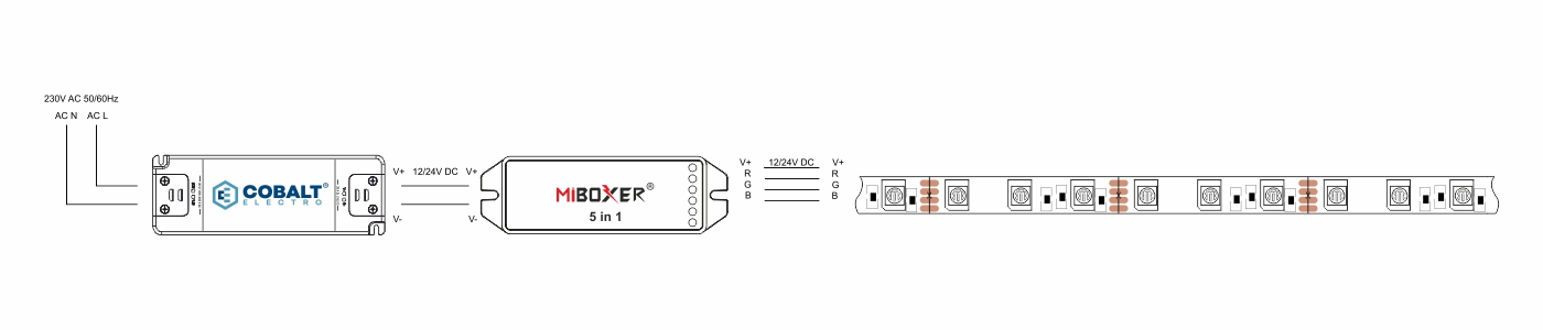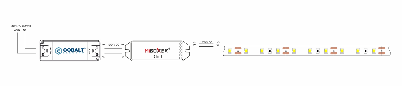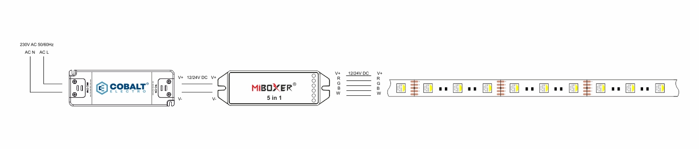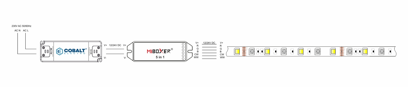 Slúži na ovládanie jednofarebných, CCT, farebných RGB, RGBW a RGBCCT LED pásikov.