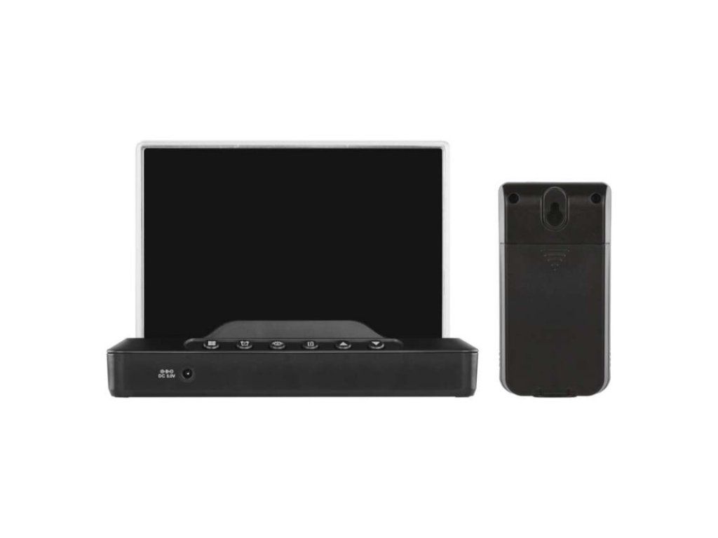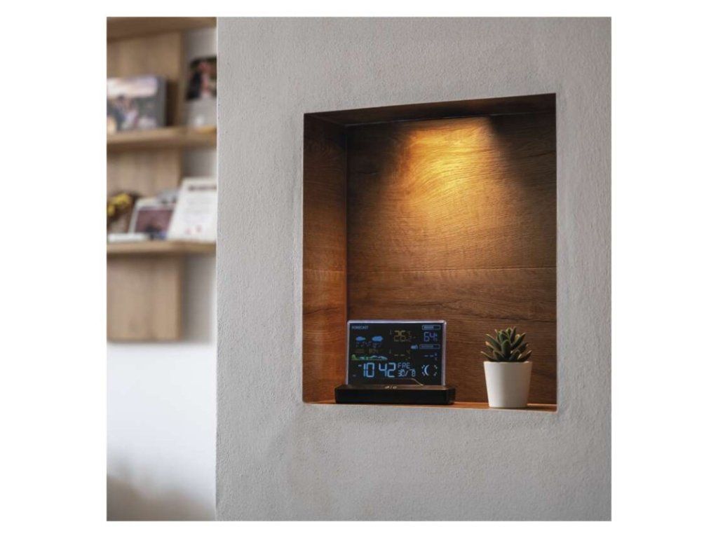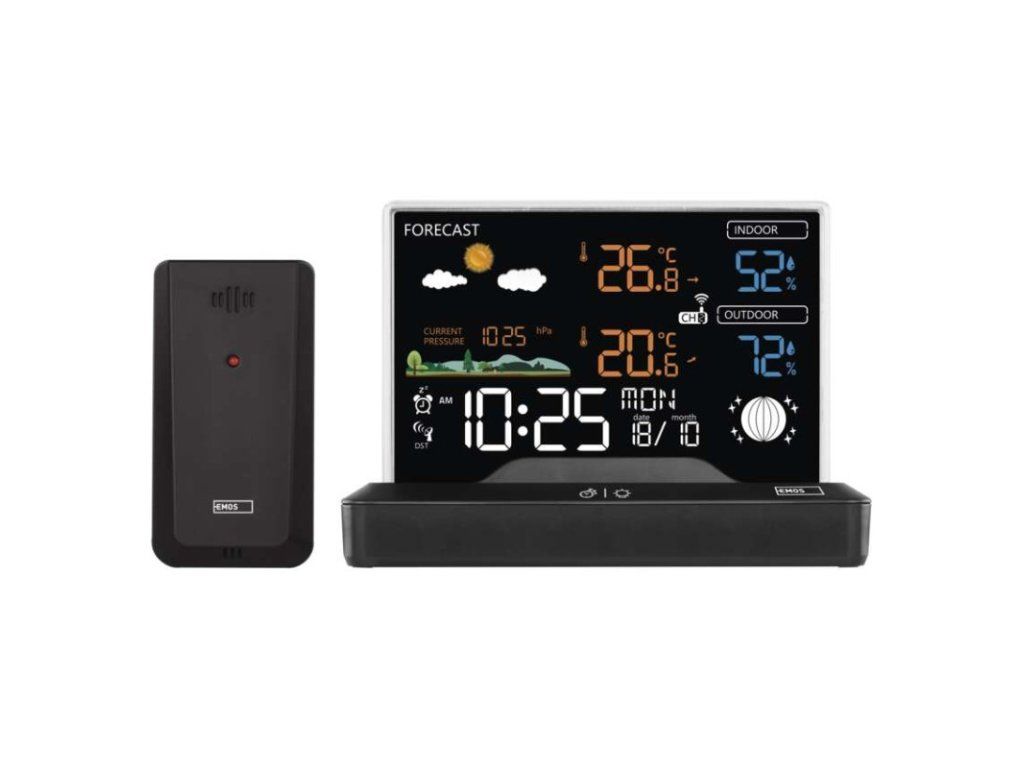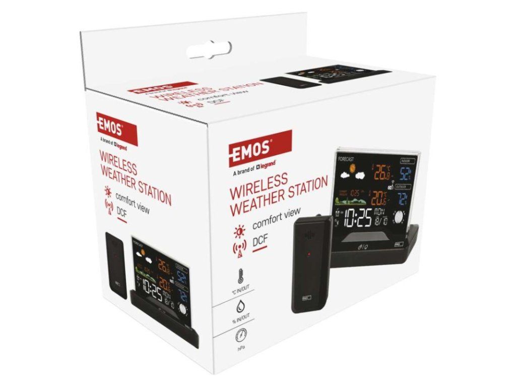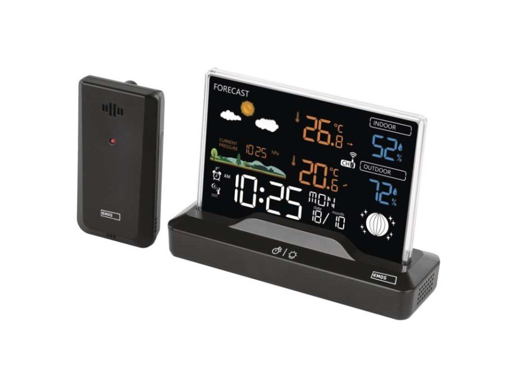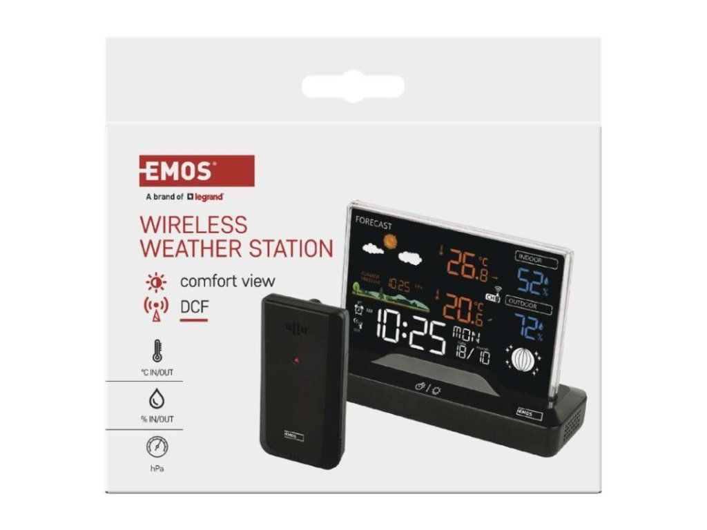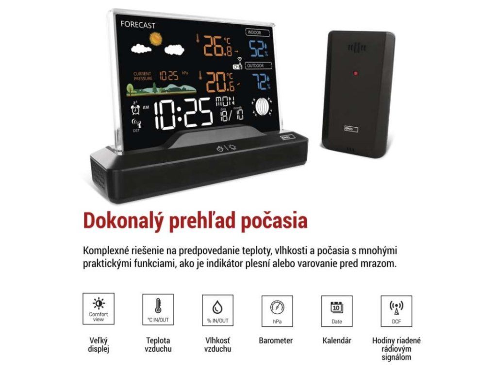 12/24 formát času: áno anemometer: nie barometer: áno budík: áno časové pásma: áno dátum: áno dosah snímača: až 80 m drôtová sonda k čidlu: nie elektronické plošné podsvietenie: áno farebný displej (black mask) podsvietený: áno fázy mesiaca: áno hodiny: riadené DCF signálom kalendár: áno korekcia nadmorskej výšky: nie LED podsvietenie displeja: áno min. a max. teplota: áno možné ďalšie čidlo: 3 (E00387, E05018) možnosť nastavenia jednotky teploty °C/°F: °C/°F možnosť zavesenia na stenu: nie napájanie čidla: 2× 1,5 V AAA (nie sú súčasťou balenia) napájanie stanice: 2× 1,5 V AAA (nie sú súčasťou balenia) opakované budenie: áno predajný obal: 1 ks, krabička predpoveď počasia: áno prenosová frekvencia: 433 MHz prevedenie teplomera: bezdrôtové produkt: metestanica projekcia: nie rozmer čidla: 50 × 25 × 95 mm rozmer hlavnej jednotky: 155 × 50 × 113 mm sieťový adaptér: áno, 5 V DC/1 000 mA (súčasťou balenia) teplotná výstraha: nie trend teploty: áno trend tlaku: nie trvalé podsvietenie: áno veľkosť displeja: 127 × 85 mm vnútorná teplota: 0 °C až +50 °C, rozlíšenie 0,1 °C vnútorná vlhkosť: 20 % až 99 % RV, rozlíšenie 1 % vonkajšia teplota: -40 °C až +70 °C, rozlíšenie 0,1 °C vonkajšia vlhkosť: 20 % až 99 % RV, rozlíšenie 1 % zrážkomer: nieDodatočné parametre
