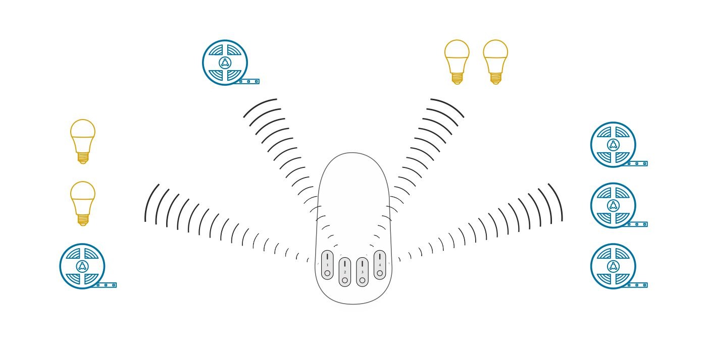 Takto je možné ovládať až 4 miestnosti jedným ovládačom (napr. kuchyňa, spálňa, chodba, kúpeľňa).