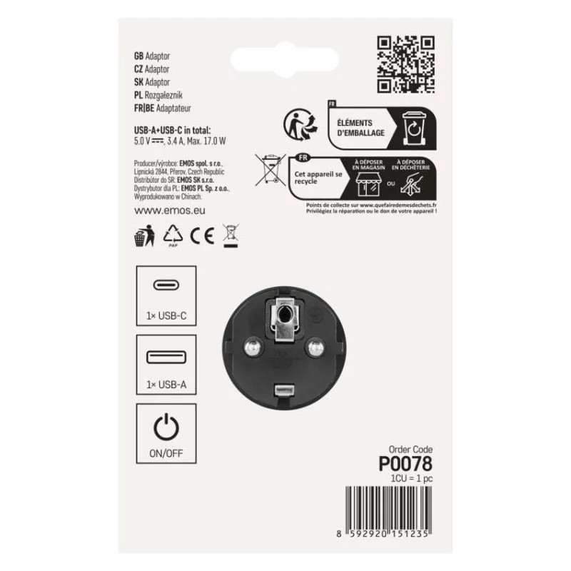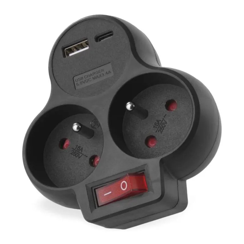 produkt: rozbočovacia zásuvka 2×+1×USB-A+1×USB-C 5 V DC 3,4 A max. 17 W