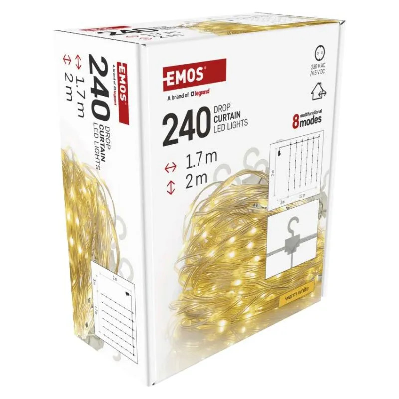 • LED vianočná drop reťaz – záclona, 1,7x2 m, vonkajšia aj vnútorná, teplá biela, programy