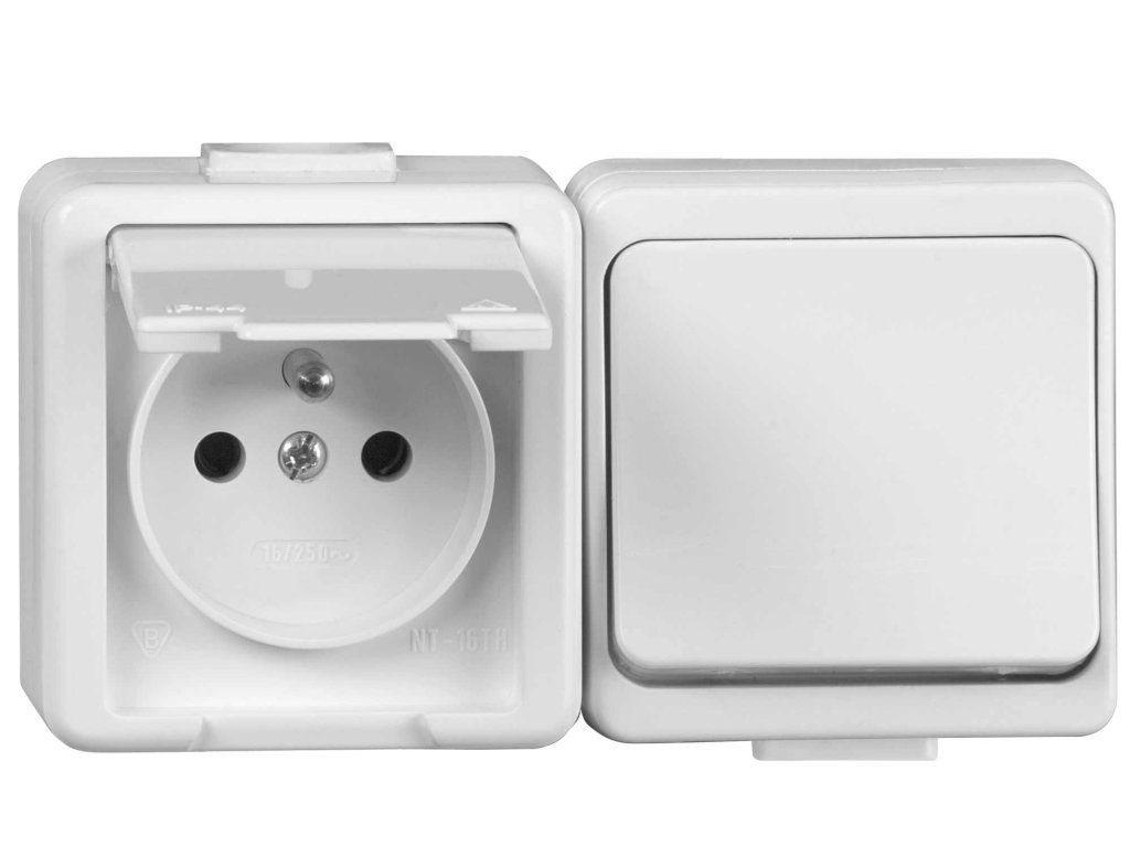 Spínač jednopólový s podsvietením s jednonásobnou zásuvkou 2P+PE na povrch. Chránené pred prienikom striekajúcej vody a pevných častíc nad 1mm - IP44.Dodatočné parametre