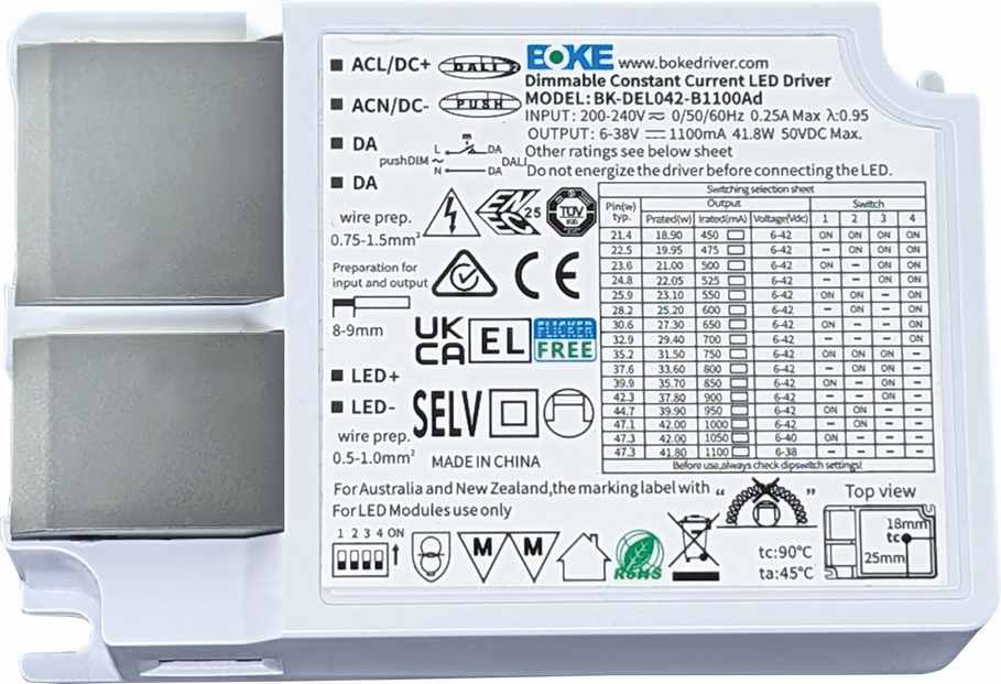 16 možných nastavení konštantného výstupného prúdu pomocou DIP prepínačov v rozsahu 450-1100mA.