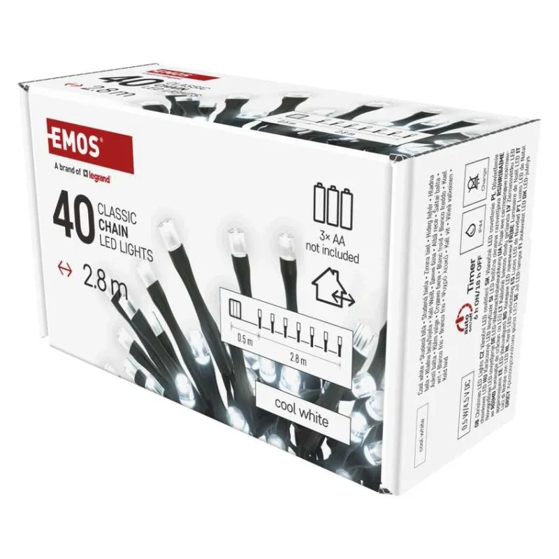• LED vianočná reťaz, 2,8 m, 3x AA, vonkajšia aj vnútorná, studená biela, časovač
