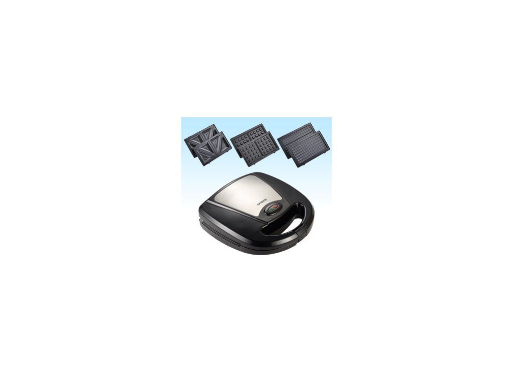 Multifunkčný sendvičovač 3 v 1 3 výmenné platne s kvalitným nepriľnavým povrchom Vymeniteľné platne pre sendviče,vafle a grilovanie Tepelne izolované držadlo Jednoduché čistenie, platne umývateľné aj v umývčke riadu Svetelná signalizácia (napájanie, ohrev) Tepelná poistka Napájanie: 230V~ 50Hz, 750 WDodatočné parametre