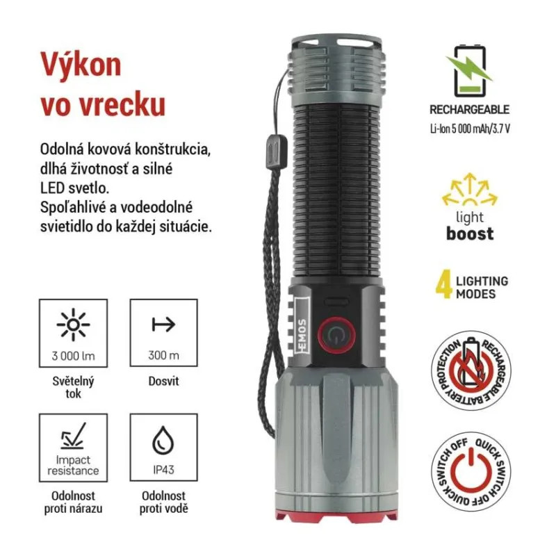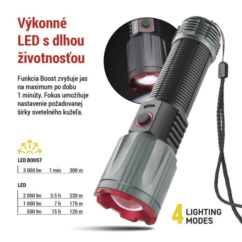 doba svietenia detail: LED BOOST – 1 min, LED 100 % – 3,5 h, LED 50 % – 7 h, LED 20 % – 15 h