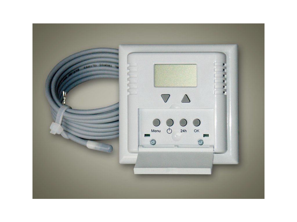 Programovateľný termostat k podlahovému vykurovaniu. Programovateľný termostat je určený k regulácii vykurovania v obytných miestnostiach. Základný princíp regulácie spočíva v prepínaní medzi nastavenou komfortnou a útlmovou teplotou v preddefinovaných časových intervaloch. Možnosť snímania: priestor, podlaha, priestor + podlaha. Termostat sa inštaluje do montážnej krabice KU 68, je vybavený výstupným prepínacím relé 230VAC/16A. (maximálna doporučená záťaž 2 000W). Záloha chodu pri výpadku 6 hodín. Zobrazuje aktuálnu teplotu priestoru. Podlahová sonda je súčasťou balenia.Buďte prvý, kto napíše príspevok k tejto položke.