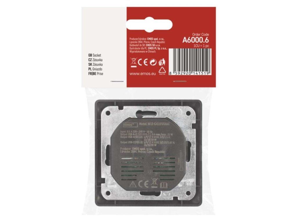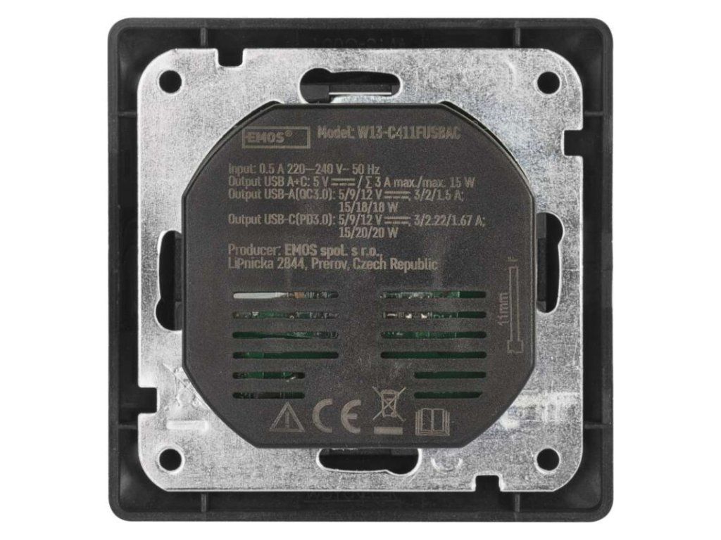 | produkt: | jedna zásuvka s ochranným kolíkom a výstupom USB 3 A max. |